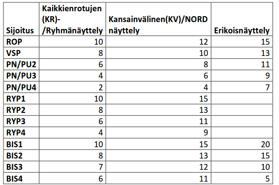 Pistetaulukko näyttelysijoituksista alla